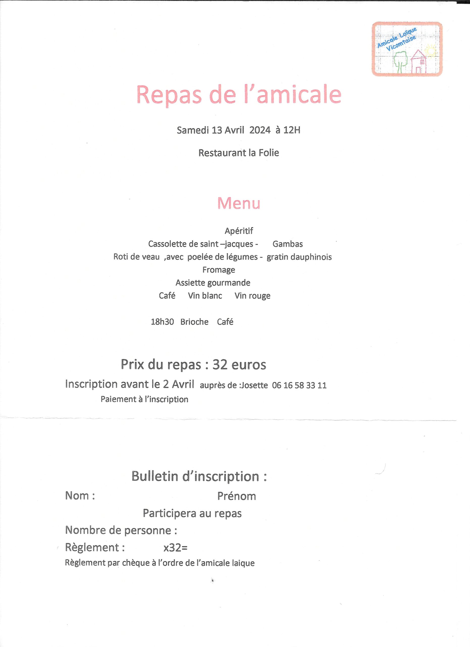 Repas des amicalistes le samedi 13 avril 2024 à 12h