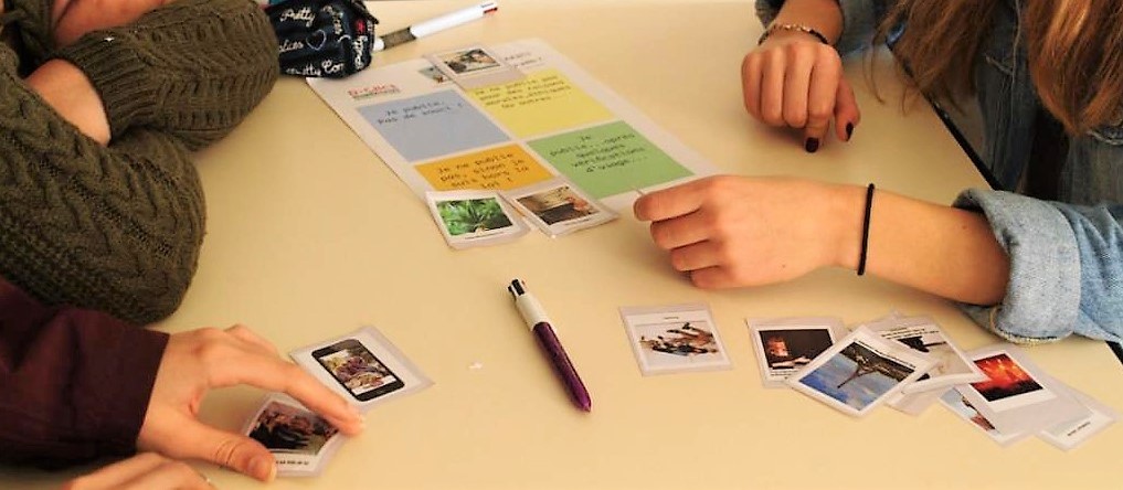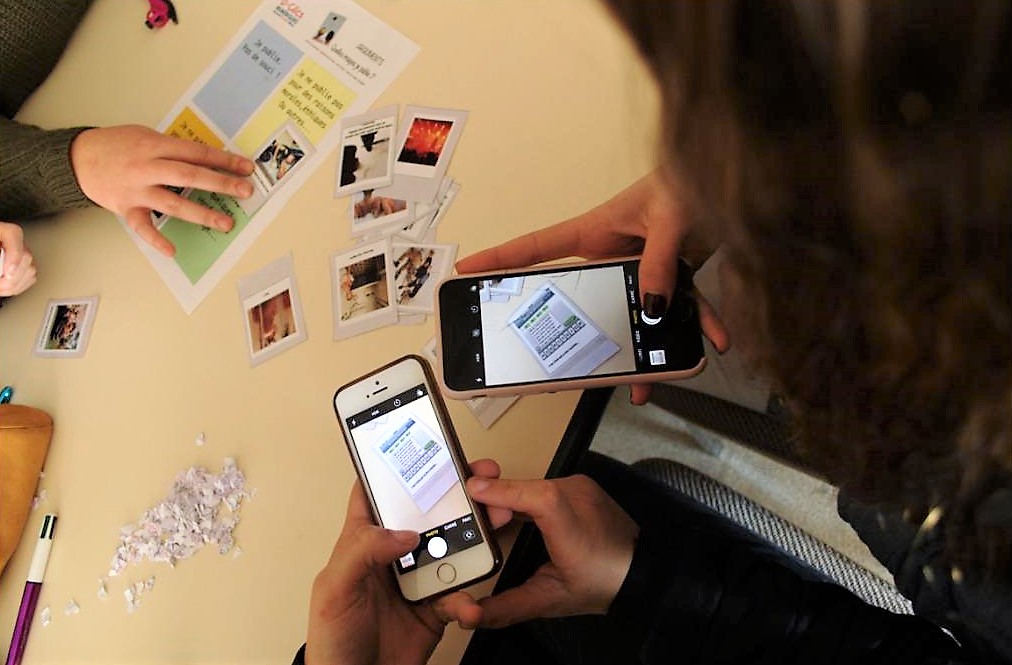 Enfin, pour terminer ces 2h d’actions, une enveloppe contenant des images postées sur des réseaux sociaux ou privées, est distribuée. Chaque groupe dispose également d’une feuille. Dessus est noté : « je publie sans soucis », « je ne publie pas car c’est illégal », « je publie après autorisation »,je ne publie pas pour raison éthique… ». Les élèves déposent chaque photo dans l’affirmation correspondante. Certaines images sont plus compliquées à poser dans la phrase correspondante. En effet, leurs subtilités dans les mots et/ou photos portent à confusion.