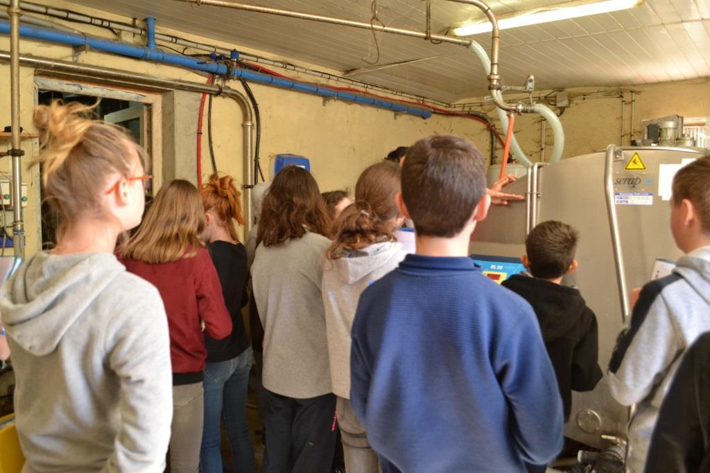 Les élèves découvrent la salle de traite et de quelle façon le lait des vaches est récupéré puis stocké. Qu’est ce que le label AB ? Quelles différences entre les laits écrémés ou non que l’on retrouve dans les supermarchés ? Vient ensuite la dégustation du lait cru puis un moment de découverte auprès des veaux.