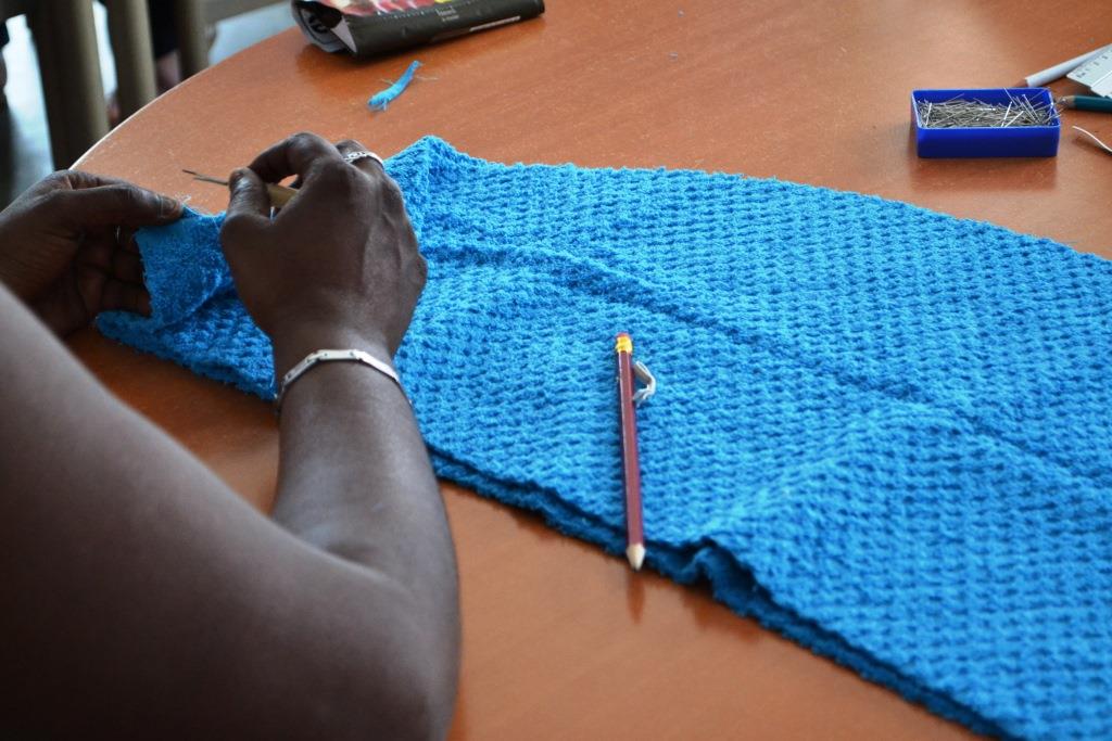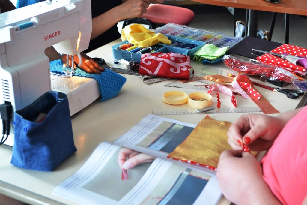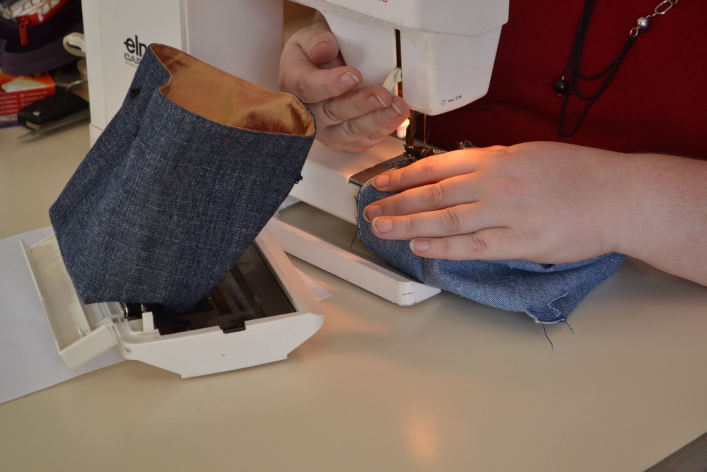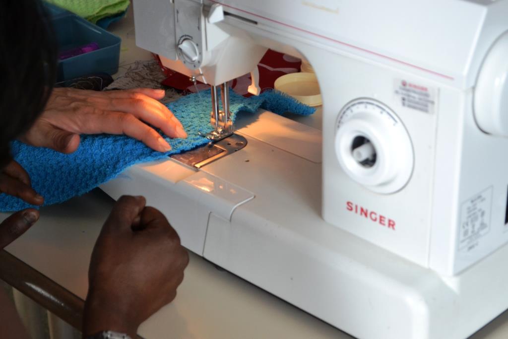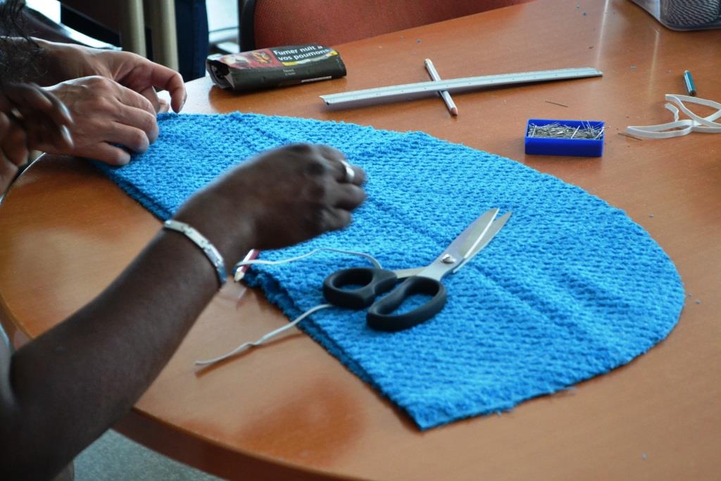 Les participantes réalisent des boites en tissu à partir de jean pour ranger des lingettes démaquillantes. Ces mêmes lingettes sont également réalisées durant l’atelier à partir de serviette de toilette.