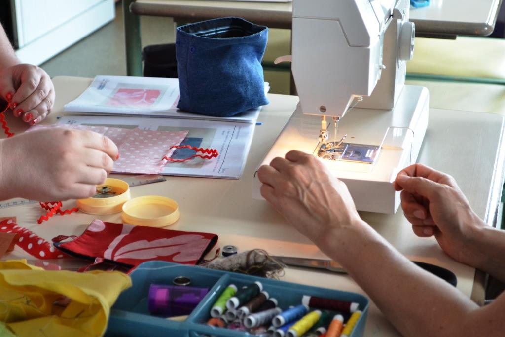 A la maison de quartier Liberté à La Roche-sur-Yon, Aline anime un atelier d’éco confection ayant un double objectif : apprendre à faire soi-même avec du matériel de récupération tout en touchant du doigt les thématiques du développement durable.