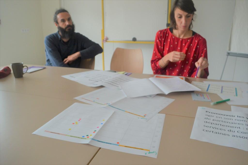 Des cases sont remplis des actions diverses sur des thèmes différents avec des partenaires indispensables pour les réaliser. On rempli en premier lieu un tableau individuellement, puis par groupe on en sélectionne deux sur 4 environ présentés. Enfin en groupes on en sélectionne 4 sur les 4 groupes présentés.