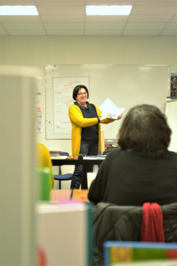 Ensuite, un aspect théorique est proposé pour synthétiser et apporter du complément aux affirmations déposées sur la roue. L’occasion pour la formatrice de réaffirmer l’importance de la charte de l’association dans l’organisation des lectures et donc dans la gestion du groupe. Ainsi la composition d’un groupe de 6 enfants maximum est essentiel. De plus, pendant la lecture, un langage physique et gestuel doit être ajouté à la parole pour attirer l’attention de ses auditeurs.