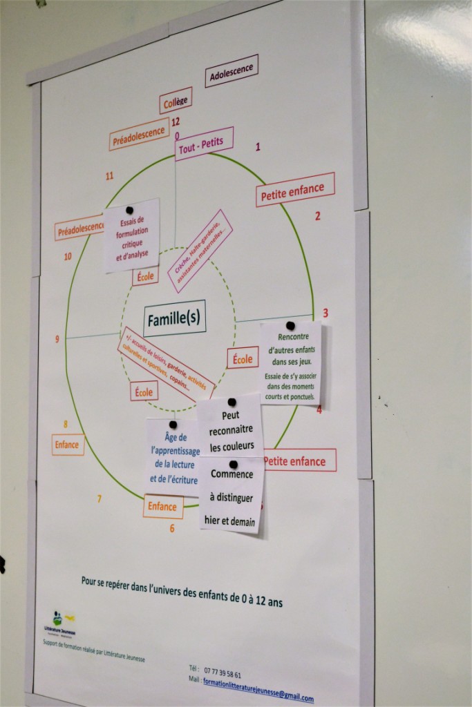 Début de la matinée avec la lecture de l’album jeunesse « La première fois que je suis née» de Vincent Cuvellier et Charles Dutertre. Il énonce les premières fois d’une fille, de sa naissance à la naissance de son enfant. Cette lecture tisse le lien avec l’activité de la roue des enfants (découpée en tranche d’âge de 1 à 12 ans). Chaque bénévole dispose d’une affirmation « première fois » sur le développement social et psychologique de l’enfant. Puis, ils déterminent ensemble où la placer dans la tranche d’âge correspondante.