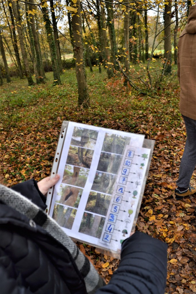 Pour entamer notre épopée dans la nature, Philippe, salarié de la fédération et animateur au terrain d’aventure, nous présente un premier jeu de piste. Nous disposons de photos d’arbres prises sous des angles distincts avec un numéro dans l’ordre croissant. Après avoir récupéré le premier, nous devons retrouver une étiquette où un dessin d’arbre est inscrit. Puis noter le numéro d’arbre sur la bonne case.